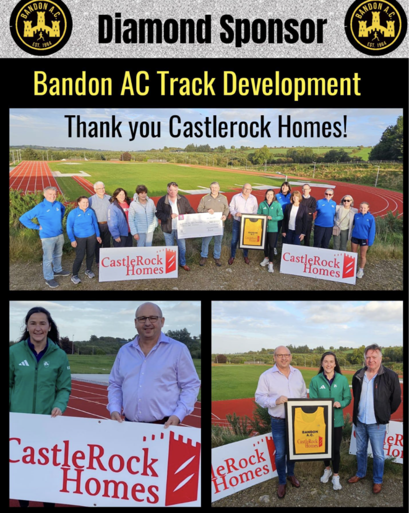 Bandon Athletics Club is delighted to welcome Castlerock Homes as a Diamond Sponsor for our Track Development.We extend our heartfelt thanks to Tim Murray and John Daly of Castlerock Homes for their generous support—not just financially, but also through the invaluable advice and assistance in the final stages of the project. Your financial support will be instrumental in bringing the Hammer Cage to life.Castlerock