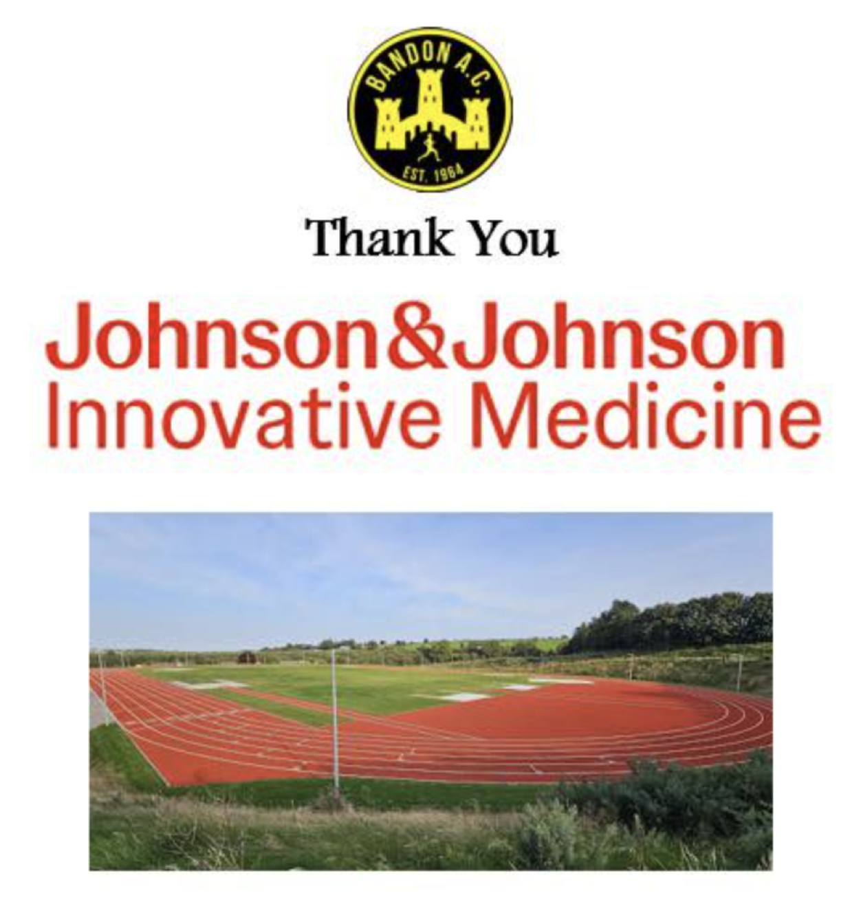 Bandon AC would like to very gratefully acknowledge the generous sponsorship of Johnson & Johnson Innovative Medicine, Ringaskiddy who have sponsored €1000 towards the track development as part of their Janssen Sciences Ireland Club Sports Organisation Sponsorship program. he club very much appreciate your generous support which will be put to immediate use as part of the development. Thanks too to Daire Harrington for nominating the club!!